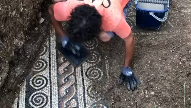 Perfectly preserved roman mosaic floor discovered under vineyard near verona.